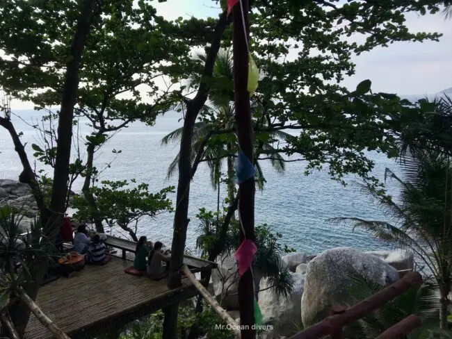 大きな石の隙間に作った階段を降りていくと海際の石の上まで行くことができ、シミランのバランスロックのようでした。思わずドボンと海に入りたいほど、キレイな海を眺めることができ最高のロケーションでした。またカフェの隣にはキャンプができる施設もあり、貸しテントも用意しているそうですよ。