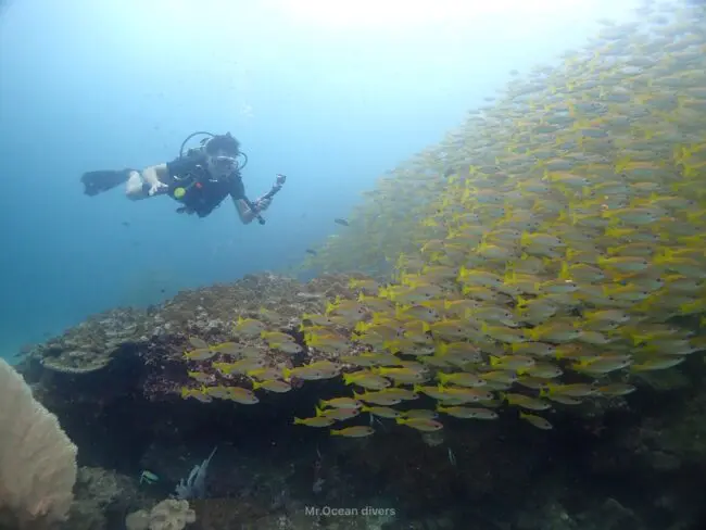 3本目、ドクマイ島。水中はちょっと流れもあり時間的に暗く感じました。小さい島なのであまり泳ぐと波の中でエグジットになりそうだったので、小さい範囲でダイビング。ここでもキンセンフエダイの群れがすごかったです。あとは浅場でウミウチワなどを見て終了しました。
